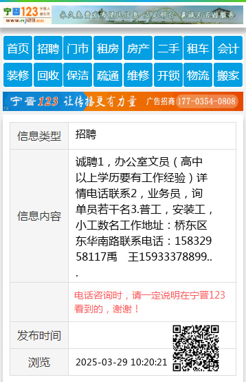 诚聘1,办公室文员(高中以上学历要有工作经验)详情电话联系2,业务员,询单员若干名3.普工,安装工,小工数名工作地址:桥东区东华南路联系电话:15832958117禹 王15933378899
