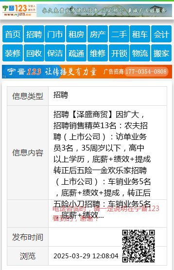 招聘【泽盛商贸】因扩大,招聘销售精英13名:农夫招聘(上市公司):访单业务员3名,35周岁以下,高中以上学历,底薪+绩效+提成转正后五险一金欢乐家招聘(上市公司):车销业务5名,底薪+绩效+提成,转正后五险小刀招聘:车销业务5名,底薪+绩效+超高提成,转正后五险招聘:送货司机1名,底薪+提成,+福利地址:开元南路,电话:15350865508, 15130984321 聘 |