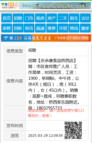 招聘【庆余康食品桥西店】聘:市区宣传推广人员:工作简单,时间灵活,工资:1900,早8晚6、中午休,公休4天(周日),男(30以内),女(45以内)。销售:底薪+提成,另聘兼职数名,地址:桥西家乐园附近。电:18032955733 聘