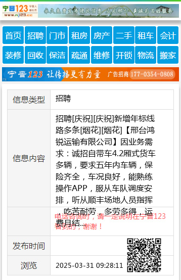 招聘[庆祝][庆祝]新增年标线路多条[烟花][烟花]【邢台鸿锐运输有限公司】因业务需求:诚招自带车4.2厢式货车多辆,要求五年内车辆,保险齐全,车况良好,能熟练操作APP,服从车队调度安排,听从顺丰场地人员指挥,吃苦耐劳,多劳多得,运费月结。地址:邢台市南和区贾宋镇润沃物流园A区。联系电话: 13930922348 , 15130997070 聘 |