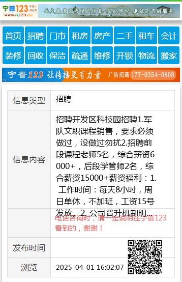招聘开发区科技园招聘1.军队文职课程销售,要求必须做过,没做过勿扰2.招聘前段课程老师5名,综合薪资6000+,后段学管师2名,综合薪资15000+薪资福利:1. 工作时间:每天8小时,周日单休,不加班,工资15号发放。2. 公司晋升机制明确,提供良好的职业发展机会。3. 团队氛围好,会组织不定期的团建活动。☎15028884056(微信同号) 聘 |