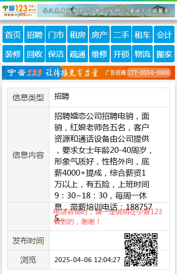 招聘婚恋公司招聘电销,面销,红娘老师各五名,客户资源和通话设备由公司提供,要求女士年龄20-40周岁,形象气质好,性格外向,底薪4000+提成,综合薪资1万以上,有五险,上班时间9:30~18:30,每周一休息,带薪培训电话:18875757100同微信,地址:世贸天街,工作环境好,干净明亮办公室,老板事少,好说话,想挣钱的赶紧来。 聘 |