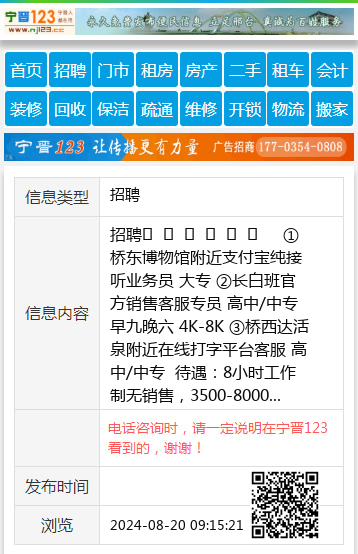 招聘 ①桥东博物馆附近支付宝纯接听业务员 大专 ②长白班官方销售客服专员 高中/中专 早九晚六 4K-8K ③桥西达活泉附近在线打字平台客服 高中/中专 待遇:8小时工作制无销售,3500-8000双休五险一金提供住宿;要求:20-35岁,有毕业证;联系: 16633966915/17633190052 聘