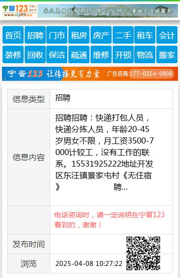 招聘招聘:快递打包人员,快递分拣人员,年龄20-45岁男女不限,月工资3500-7000计较工,没有工作的联系。15531925222地址开发区东汪镇景家屯村《无住宿》 聘