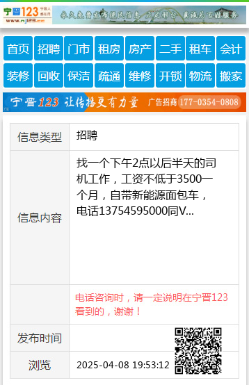 找一个下午2点以后半天的司机工作,工资不低于3500一个月,自带新能源面包车,电话13754595000同V