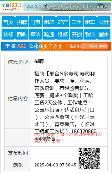 招聘【邢台N多寿司:寿司制作人员,要求干净、利索、带薪培训,有经验者优先,底薪十提成+全勤奖十工龄工资2天公休,工作地点:公园东街店(达活泉东门口)、公园西街店(阳光国际北门)、育英街店。(临时工短期工勿扰) 18632086096同微信 聘