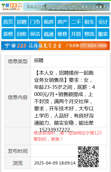【本人女,招聘搭伴一起跑业务女销售员】要求:女,年龄23-35岁之间,底薪:4000元/月+销售额提成,上不封顶,满两个月交社保,要求,开车技术好,大专以上学历,人品好,有良好沟通能力、踏实安稳,能出差,15233937222