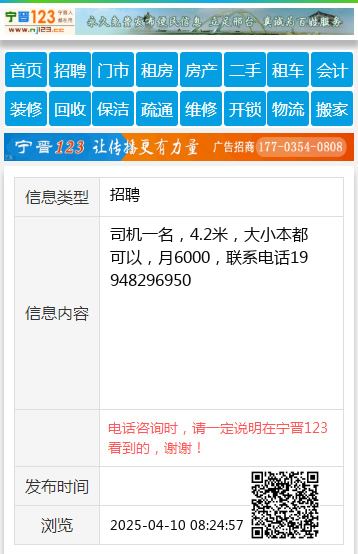 司机一名,4.2米,大小本都可以,月6000,联系电话19948296950