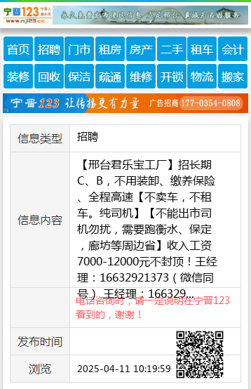 【邢台君乐宝工厂】招长期C、B,不用装卸、缴养保险、全程高速【不卖车,不租车。纯司机】【不能出市司机勿扰,需要跑衡水、保定,廊坊等周边省】收入工资7000-12000元不封顶!王经理:16632921373(微信同号) 王经理:16632961920 (微信同号)面试地址:邢台开发区创智园7楼704。