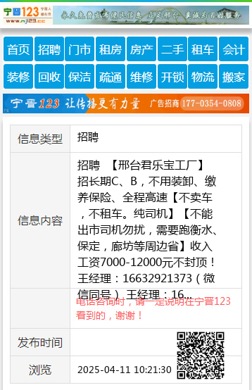 邢台学院南门附近物流招聘四米二高栏司机跑石家庄要求有开货车经验者最好附近住的15075971314骗子谨防上当
