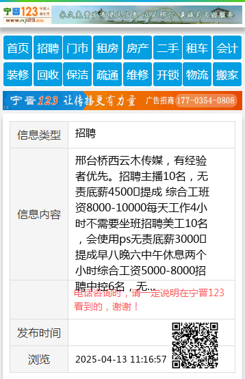 邢台桥西云木传媒,有经验者优先。招聘主播10名,无责底薪4500➕提成 综合工班资8000-10000每天工作4小时不需要坐班招聘美工10名,会使用ps无责底薪3000➕提成早八晚六中午休息两个小时综合工资5000-8000招聘中控6名,无责底薪3500➕提成,综合工资5000-7000,联系人申亮电话15175743999(微信同步) |