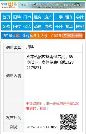 火车站招夜班男保洁员,65岁以下,身体健康电话13292179871