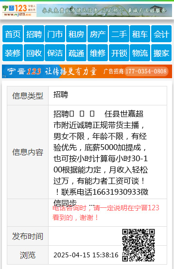 招聘 任县世嘉超市附近诚聘正规带货主播,男女不限,年龄不限,有经验优先,底薪5000加提成,也可按小时计算每小时30-100根据能力定,月收入轻松过万,有能力者工资可谈!!联系电话16631930933微信同步 聘