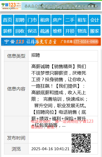 高薪诚聘【销售精英】我们不谈梦想只聊薪资,厌倦死工资?投身销售,让你收入一路狂飙!【我们提供】:高额底薪和提成,收入无上限; 完善培训,快速成长; 晋升空间,职业发展无忧。【招聘岗位】电话销售(底薪+绩效+福利+保险+晋升+红包奖励等,综合薪资8000上不封顶,不拖欠工资),销售主管(综合薪资1W上不封顶), 电话销售经验者优先。地址:邢任公路电话:16632903257 |