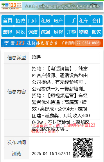 招聘:【电话销售】,纯意向客户资源、通话设备均由公司提供,有无经验均可,公司提供一对一带薪培训。招聘:【短视频运营】有经验者优先待遇:高底薪+绩效+高提成+公休4天+定期团建+满勤奖,月均收入4000-2w上不封顶地址:襄都区振兴路东城天骄南行电话:18962060409,微信同号。