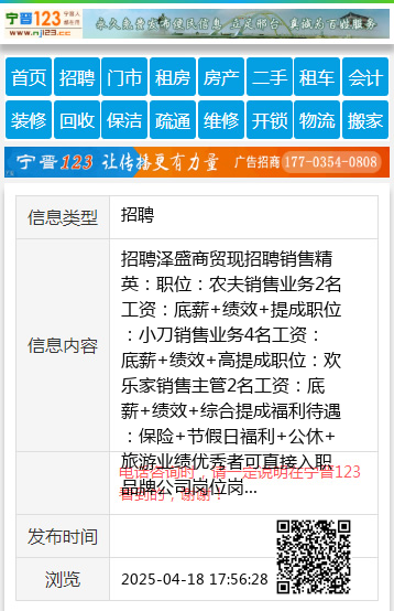 招聘泽盛商贸现招聘销售精英:职位:农夫销售业务2名工资:底薪+绩效+提成职位:小刀销售业务4名工资:底薪+绩效+高提成职位:欢乐家销售主管2名工资:底薪+绩效+综合提成福利待遇:保险+节假日福利+公休+旅游业绩优秀者可直接入职品牌公司岗位岗位:送货司机2名 库管1名工资:底薪+提成+福利电话:15350865508 聘 |