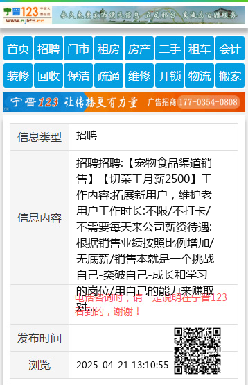 招聘招聘:【宠物食品渠道销售】【切菜工月薪2500】工作内容:拓展新用户,维护老用户工作时长:不限/不打卡/不需要每天来公司薪资待遇:根据销售业绩按照比例增加/无底薪/销售本就是一个挑战自己-突破自己-成长和学习的岗位/用自己的能力来赚取对应的报酬。联系电话:13104847180(同微信) 聘