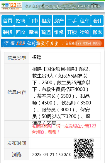 招聘【国企项目招聘】船员.救生员9人(船员55周岁以下,2500,救生员35周岁以下,有救生员资格证4000),茶室店长(6500)、甜品师(4500)、饮品师(3500)、服务员(3000)、保安员(50周岁以下3200)、保洁员(55周岁以下2800)☎15532902135 聘