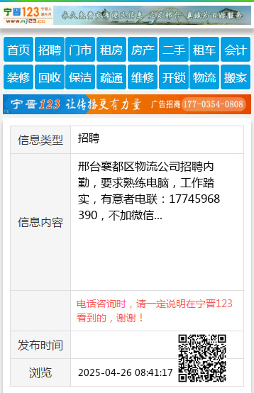 邢台襄都区物流公司招聘内勤,要求熟练电脑,工作踏实,有意者电联:17745968390,不加微信