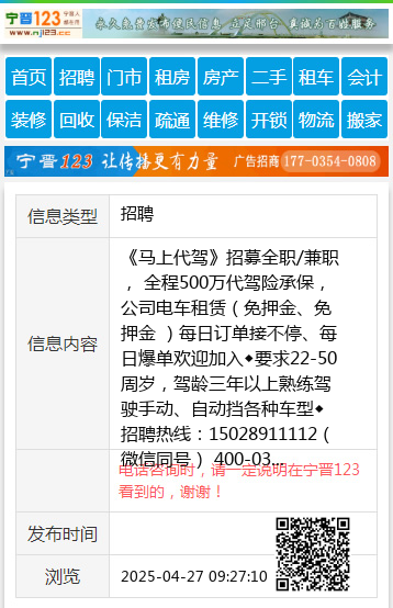 《马上代驾》招募全职/兼职, 全程500万代驾险承保,公司电车租赁(免押金、免押金 )每日订单接不停、每日爆单欢迎加入◆要求22-50周岁,驾龄三年以上熟练驾驶手动、自动挡各种车型◆招聘热线:15028911112(微信同号) 400-0319-717 地址:中华路168号(一中对面58家政二楼)