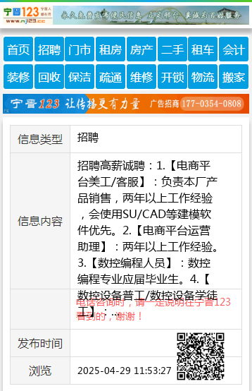 招聘高薪诚聘:1.【电商平台美工/客服】:负责本厂产品销售,两年以上工作经验,会使用SU/CAD等建模软件优先。2.【电商平台运营助理】:两年以上工作经验。3.【数控编程人员】:数控编程专业应届毕业生。4.【数控设备普工/数控设备学徒工】:30岁以下。以上岗位月休4天,合格者可办保险。地点:襄都区田家庄工业南街 于先生:19133992061 聘 |