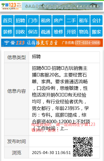 招聘🔷招聘✅古玩销售主播➕客服20名。主要经营石雕、家具。要求普通话流畅,口齿伶俐,思维敏捷,性格活泼开朗👉有无经验均可,有行业经验者优先,男女都行,年龄23到35,学历:专科。底薪➕提成,综合薪资4000-12000上不封顶(工作时间:上八下五,单休,工作长期稳定)欢迎有梦想的小伙伴加入 【另招打包师傅男士两名】🏢地址:邢台襄都区富强路金旺角物流园📲电/微15175460988 聘 |