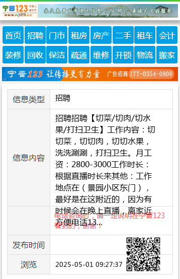 招聘招聘【切菜/切肉/切水果/打扫卫生】工作内容:切切菜,切切肉,切切水果,洗洗涮涮,打扫卫生。月工资:2800-3000工作时长:根据直播时长来其他:工作地点在(景园小区东门),最好是在这附近的,因为有时候会在晚上直播,离家近方便电话13104847180 聘