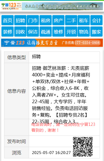 招聘 御芝林涨薪:无责底薪4000+奖金+提成+月度福利+单双休/双休+社保+年假+公积金,综合收入6-8K,收入高者2W+。女生可住宿。22-45周,大专学历,半年销售经验。负责电话回访服务+复购。【招聘专员2名】22-35周,综合收入3.5-4.5K,有经验优先。地址:银座+开发区科技园+南和。电话:15131955612 / 15227397530 聘 |