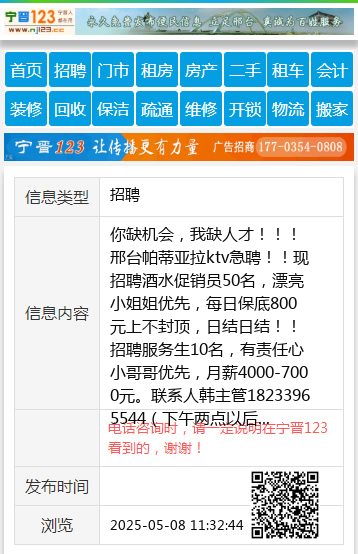 你缺机会,我缺人才!!!邢台帕蒂亚拉ktv急聘!!现招聘酒水促销员50名,漂亮小姐姐优先,每日保底800元上不封顶,日结日结!!招聘服务生10名,有责任心小哥哥优先,月薪4000-7000元。联系人韩主管18233965544(下午两点以后联系)