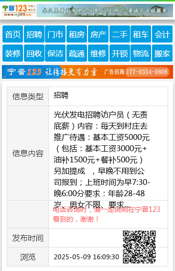 光伏发电招聘访户员(无责底薪)内容:每天到村庄去推广待遇:基本工资5000元(包括:基本工资3000元+油补1500元+餐补500元)另加提成 ,早晚不用到公司报到;上班时间为早7:30-晚6:00分要求:年龄28-48岁、男女不限、要求有私家车、公司地址:襄都区爱特园联系电话 刘先生18330016583