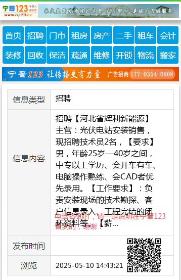 招聘【河北省辉利新能源】主营:光伏电站安装销售,现招聘技术员2名,【要求】男,年龄25岁—40岁之间,中专以上学历、会开车有车、电脑操作熟练、会CAD者优先录用。【工作要求】:负责安装现场的技术勘探、客户信息录入、工程完结的闭环资料等。【薪资待遇】底薪加提成,月收入万元左右。电话:19331967722马主任 聘 |