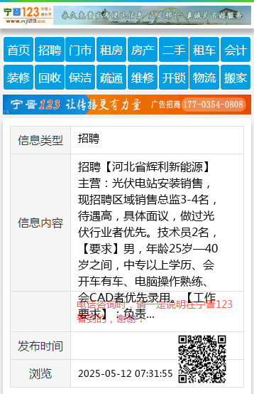 招聘【河北省辉利新能源】主营:光伏电站安装销售,现招聘区域销售总监3-4名,待遇高,具体面议,做过光伏行业者优先。技术员2名,【要求】男,年龄25岁—40岁之间,中专以上学历、会开车有车、电脑操作熟练、会CAD者优先录用。【工作要求】:负责安装现场的技术勘探、客户信息录入、工程完结的闭环资料等。【薪资待遇】底薪加提成,月收入万元左右。电话:19331967722马主任 聘 |