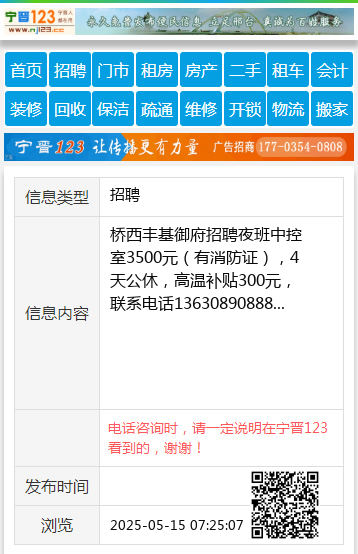 桥西丰基御府招聘夜班中控室3500元(有消防证),4天公休,高温补贴300元,联系电话13630890888