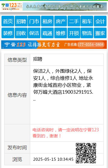 保洁2人,外围绿化2人,保安1人,综合维修1人 地址永康街金域首府小区物业,紧邻万峰大酒店19003291915