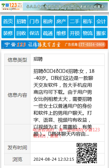 招聘📢📢招聘:女,18-40岁。✅我们这边是一款聊天交友软件,各大手机应用商店均可下载。由于用户男女比例相差太大,需要招聘一些女士以普通用户的身份和软件上的男用户聊天。打字、语音、视频均有收益,以视频为主(需露脸,有美颜)。✅具体聊天内容由自己决定,以情感、工作、生活为主,按时长计费,一分钟2-6元,工资日结、保底5000 ,有无才艺均可,公司免费带薪培育,学会后可居家工作,一部手机即可操作,无需购买任何设备。🔴禁止讨论涉黄、诈骗、以及其它违法内容,一经发现,直接封号。🏡地址:万城新天地广场☎️电话:15373212137 聘 |