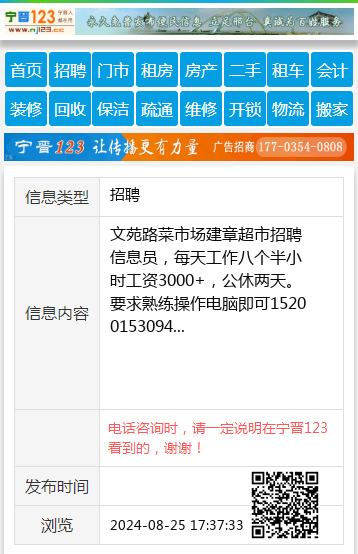 文苑路菜市场建章超市招聘信息员,每天工作八个半小时工资3000+,公休两天。要求熟练操作电脑即可15200153094 【电话咨询时,请一定说明在邢台123看到的,谢谢!】 |