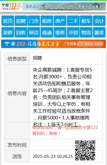 央企高薪诚聘:1.客服专员5名:月薪3000+,负责公司相关活动告知和售后服务,年龄25--45周岁;2.客服主管2名:负责团队相关事务管理培训,大专以上学历,有相关工作经验可适当放宽条件,月薪5000+3.人事助理两名注:1.每天7小时工作制,周末双休 2.养老医疗保障 3.系统培训机制,晋升空间大;国企招聘一辈子有保障李经理:15830726364 |