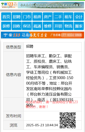 招聘车床工、勤杂工、装配工、质检员、磨床工、钻铣工、车床编程员、销售员、学徒工等岗位(有机械加工经验优先),工资3000-15000月结不等,地址:邢台开发区南环荣泰科技孵化园内(邢台新力液压设备有限公司),电话:(国13903191909)(张13231905471) 聘
