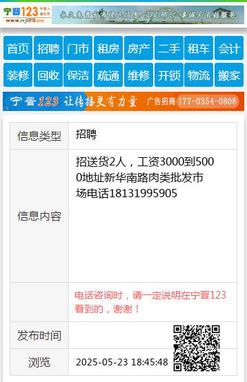 招送货2人,工资3000到5000地址新华南路肉类批发市场电话18131995905