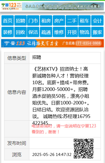 《艺林KTV》招贤纳士!高薪诚聘各种人才!营销经理10名。底薪+提成+带房费。月薪12000-50000+。招聘酒水促销员50名,漂亮小姐姐优先。日薪1000-2000+。日结日结。欢迎资源团队洽谈。 诚聘热线:苏经理16795422345,小军经理17531964567