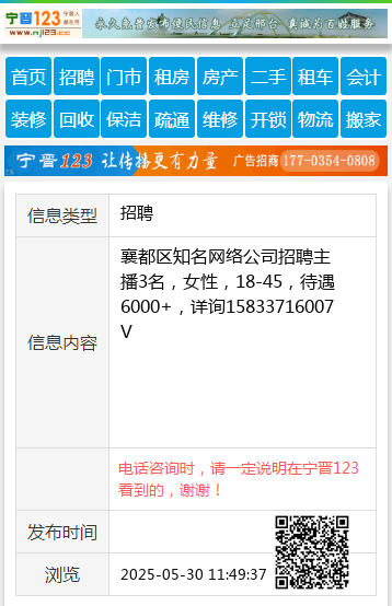 襄都区知名网络公司招聘主播3名,女性,18-45,待遇6000+,详询15833716007V