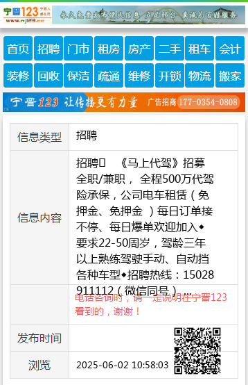 招聘 《马上代驾》招募全职/兼职, 全程500万代驾险承保,公司电车租赁(免押金、免押金 )每日订单接不停、每日爆单欢迎加入◆要求22-50周岁,驾龄三年以上熟练驾驶手动、自动挡各种车型◆招聘热线:15028911112(微信同号) 400-0319-717 地址:中华路168号(一中对面58家政二楼) 聘