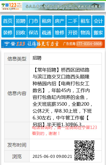 【常年招聘】桥西区团结路与滨江路交叉口路西头顺隆种植园内招【电商打包女工数名】,年龄45内,工作内容打包鱼缸内饲养的金鱼,全天班底薪3500,全勤200,公休2天,早8.30上班,下班6.30左右,中午管工作餐【另招】半天班1.30到6.30左右,月薪2000。电话15226818063,17531997717