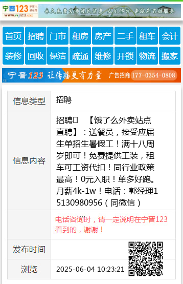 招聘 【饿了么外卖站点直聘】:送餐员,接受应届生单招生暑假工!满十八周岁即可!免费提供工装,租车可工资代扣!同行业政策最高!0元入职!单多好跑。月薪4k-1w!电话:郭经理15130980956(同微信) 聘