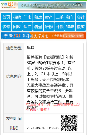 招聘招聘【老板司机】年龄:30岁-45岁任职要求:1、有经验,曾给老板开过车2年以上,2、C1 本以上,5年以上驾龄,无不良驾驶记录、无重大事故及交通违章,具有较强的安全意识;3、会喝酒、可以替领导挡酒;3、懂商务礼仪和接待工作,具有较强的服务意识,4、为人踏实、保密意识强、责任心强、能适应出差。地点:邢台市信都区碧桂园小区薪资面议。电话:15227664567 聘 |