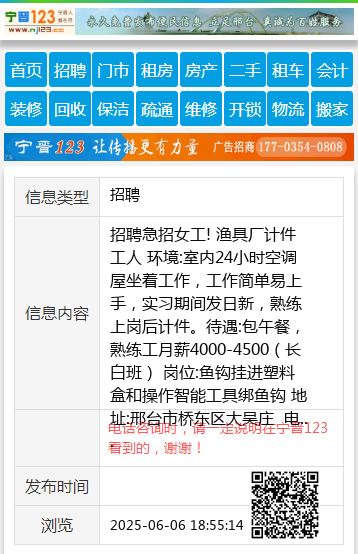 招聘急招女工! 渔具厂计件工人 环境:室内24小时空调屋坐着工作,工作简单易上手,实习期间发日新,熟练上岗后计件。待遇:包午餐,熟练工月薪4000-4500(长白班) 岗位:鱼钩挂进塑料盒和操作智能工具绑鱼钩 地址:邢台市桥东区大吴庄 电话:18233963190(李主管) 聘