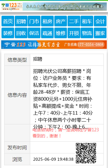 招聘光伏公司高薪招聘*岗位:访户业务员*要求:有私家车代步、男女不限、年龄28-48岁*薪资:保底工资8000元另+1000元住房补贴+高额提成+奖金*时间:上午7:40分-上午11:40分;中午休息两个小时零二十分钟;下午2:00-晚上6:00每月四天带薪休假*说明:访户业务员负责去村里租百姓的房子,工作性质简单*电话:13933730637 微信:CLME0610 聘 |