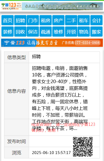 招聘电邀,电销,面邀销售10名,客户资源公司提供,要求女士20-40岁,性格外向,对金钱渴望,底薪高提成多,综合薪资1万以上,有五险,周一固定休息,错峰上下班,每天八小时上班时间,不加班,带薪培训。工作地点世贸天街,高端写字楼,有下午茶,环境好,老板事少,氛围轻松。18875757100同微信招满即止,早到早得。 |