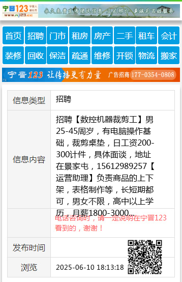 招聘【数控机器裁剪工】男 25-45周岁,有电脑操作基础,裁剪桌垫,日工资200-300计件,具体面谈,地址在景家屯,15612989257【运营助理】负责商品的上下架,表格制作等,长短期都可,男女不限,高中以上学历,月薪1800-3000另外还招【美工拍摄】有经验带作品来3000-4000,小白2500,地址开元南路古玩城,电话15369959872 聘 |