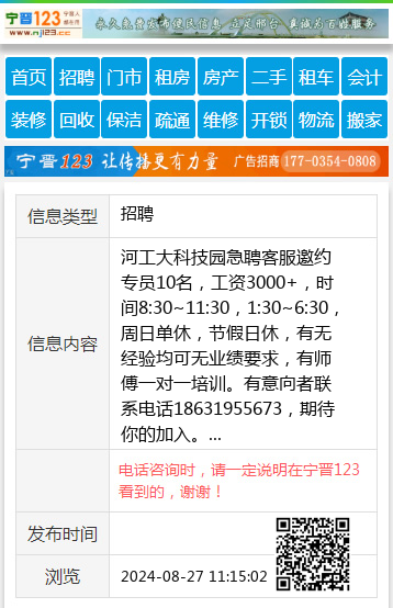 河工大科技园急聘客服邀约专员10名,工资3000+,时间8:30~11:30,1:30~6:30,周日单休,节假日休,有无经验均可无业绩要求,有师傅一对一培训。有意向者联系电话18631955673,期待你的加入。